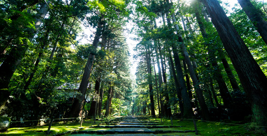 菩提林[ぼだいはやし]とよばれる老杉が約2kmにわたって続く参道は石畳を覆う苔が美しく、「日本の道百選」にも選ばれている。